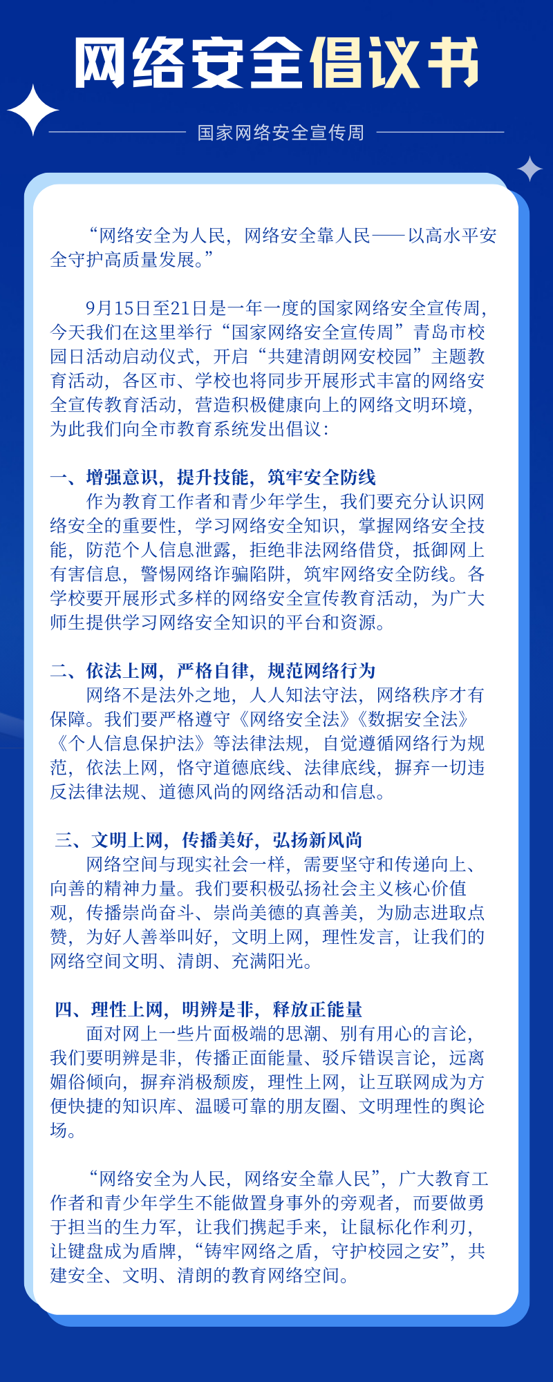 活動期間,市教育局還發(fā)出了《網(wǎng)絡(luò)安全倡議》,號召全市各級各類學(xué)校積極開展“六個一”系列活動:觀看一堂反詐網(wǎng)絡(luò)大課,組織一場網(wǎng)絡(luò)安全專題活動,開展一次網(wǎng)絡(luò)安全知識宣講,進(jìn)行一次網(wǎng)絡(luò)安全風(fēng)險排查,創(chuàng)作一批網(wǎng)絡(luò)安全創(chuàng)意作品,形成一批網(wǎng)絡(luò)安全數(shù)字資源,以更接地氣、更靈活的方式,開展形式多樣、貼近師生生活的網(wǎng)絡(luò)安全宣傳教育活動,吸引廣大師生積極參與、學(xué)有所獲。