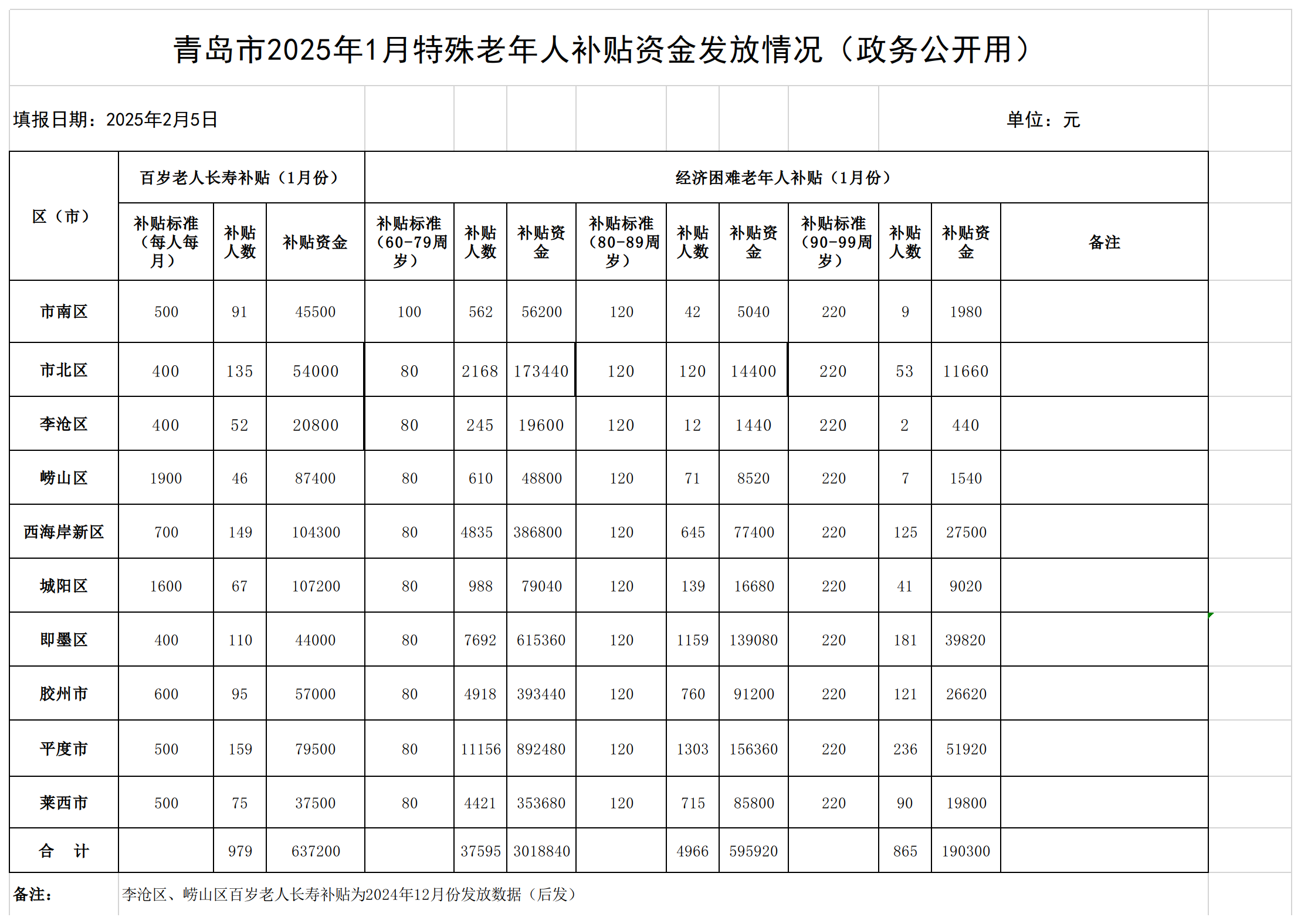 青島市2025年1月特殊老年人補貼資金發(fā)放情況