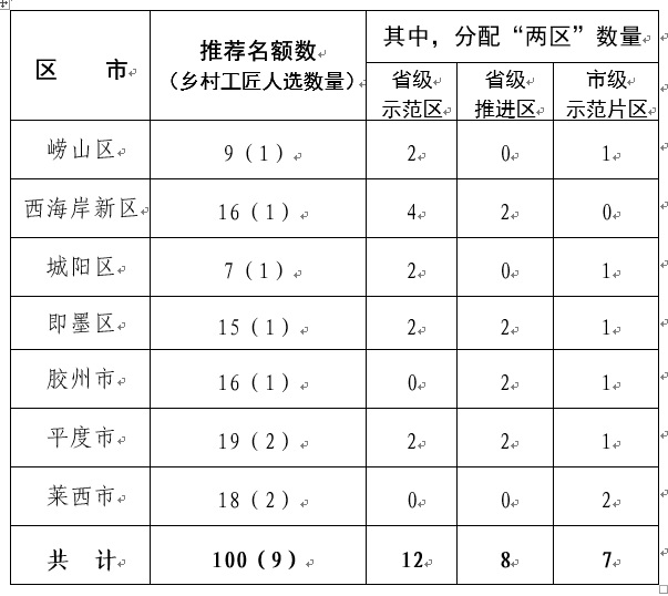 各區(qū)市(含漁業(yè))共推薦100名(含9名鄉(xiāng)村工匠),其中6個(gè)鄉(xiāng)村振興齊魯樣板省級(jí)示范區(qū)和4個(gè)省級(jí)銜接鄉(xiāng)村振興集中推進(jìn)區(qū),每個(gè)原則上分配推薦名額2個(gè);7個(gè)青島市鄉(xiāng)村振興示范片區(qū),每個(gè)原則上分配推薦名額1個(gè)。各區(qū)市按照分配名額進(jìn)行推薦(見附件1)。