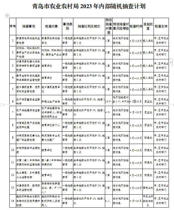 附件:1.青島市農(nóng)業(yè)農(nóng)村局2023年內(nèi)部隨機(jī)抽查計(jì)劃