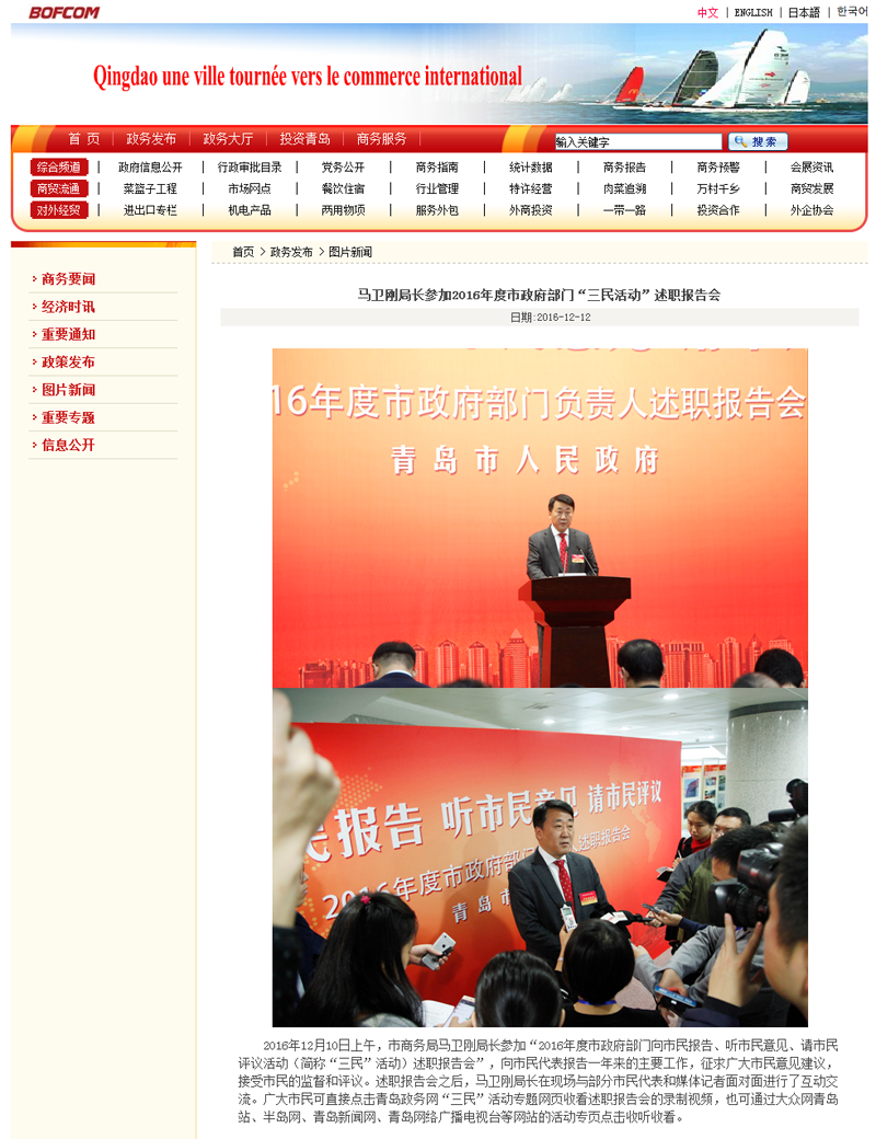 2.充分發(fā)揮報紙、廣播、電視、網(wǎng)絡等媒體作用,主動發(fā)布信息,使主流聲音和權(quán)威準確的政務信息在網(wǎng)絡領域和公共信息傳播體系中廣泛傳播。重點圍繞國際貿(mào)易中心城市建設,青島國際城市戰(zhàn)略、外貿(mào)進出口、利用外資與世界500強企業(yè)合作、“引進來”和“走出去”相結(jié)合、跨境電商等一系列活動,2016年全年各類媒體刊登商務工作信息1000余篇。