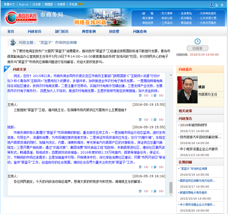 ?。ǘ┘訌娕c群眾溝通交流。局領導通過“三民活動”、“行風在線”、“在線問政”等活動加強與公眾的互動交流,全年參與在線交流活動8次。一是將“行風在線”作為政民溝通的重要渠道。局主要領導和局分管領導分別以“創(chuàng)新發(fā)展跨境電商綜試區(qū)”、“以農(nóng)村電子商務為載體推動‘菜籃子’市場供應工作”和“以示范建設為引領,加快推進我市農(nóng)村電商‘515+X’工程”為主題參加《行風在線》訪談節(jié)目,聽取市民意見,與市民互動交流。二是積極開展“網(wǎng)絡在線問政”組織工作。圍繞“聽民意、解民憂、聚民智、惠民生”的工作宗旨,全年組織5場“網(wǎng)絡在線問政”專場,對2016年青島城市購物節(jié)、“菜籃子”市場供應等工作與網(wǎng)民進行了溝通,其中“菜籃子”市場供應被評為優(yōu)秀場次。