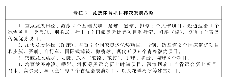 堅持以奧運爭光、亞運建功、全運領先、省運龍頭為目標,以賽促訓,優(yōu)化競技賽事項目結(jié)構(gòu)與布局,完善競技體育孵化體系,創(chuàng)新競技體育發(fā)展模式,增強競技體育選培能力,暢通人才輸送渠道,提高高水平后備人才輸送數(shù)量和質(zhì)量,提升對國家和省競技體育貢獻率。
