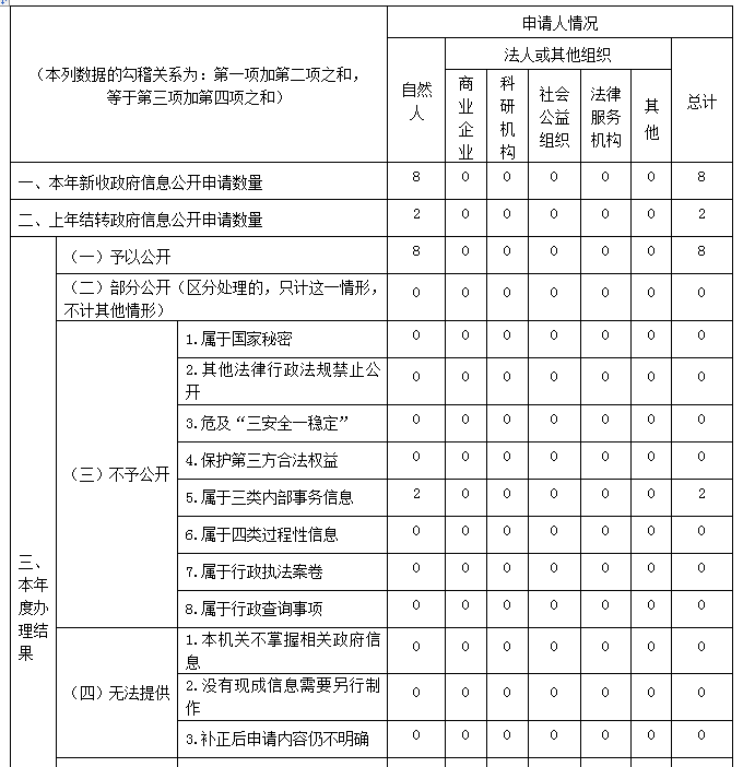 本年新收政府信息公開申請8件,上年結轉政府信息公開申請2件,無結轉下年度繼續(xù)辦理件。