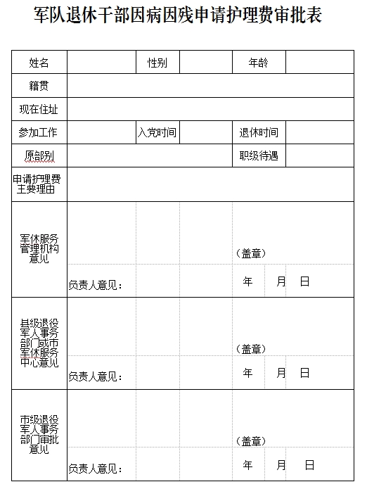 附件:1.《軍隊退休干部因病因殘申請護(hù)理費(fèi)審批表》