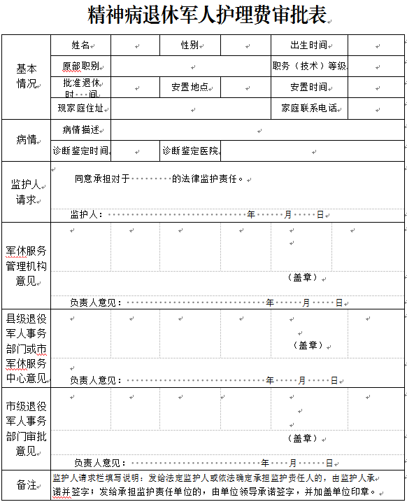 ? ? ? ? ? 2.《精神病退休軍人護(hù)理費(fèi)審批表》