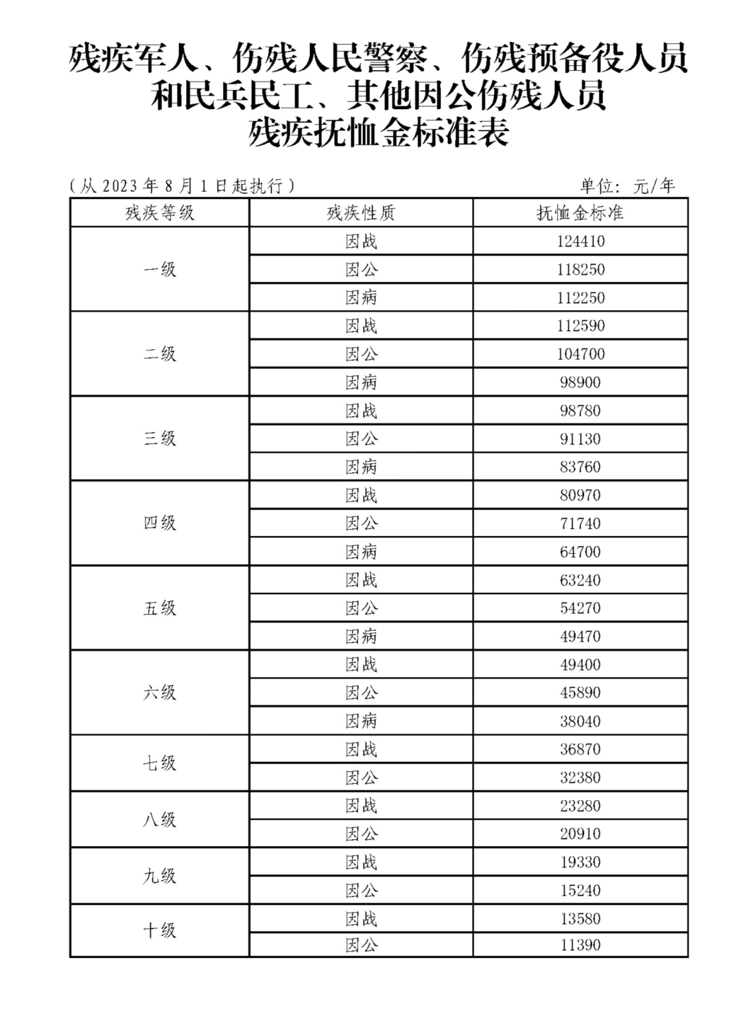 殘疾軍人(含傷殘人民警察、傷殘預備役人員和民兵民工、其他因公傷殘人員)的殘疾撫恤金標準,按照國家、山東省的統(tǒng)一標準落實。