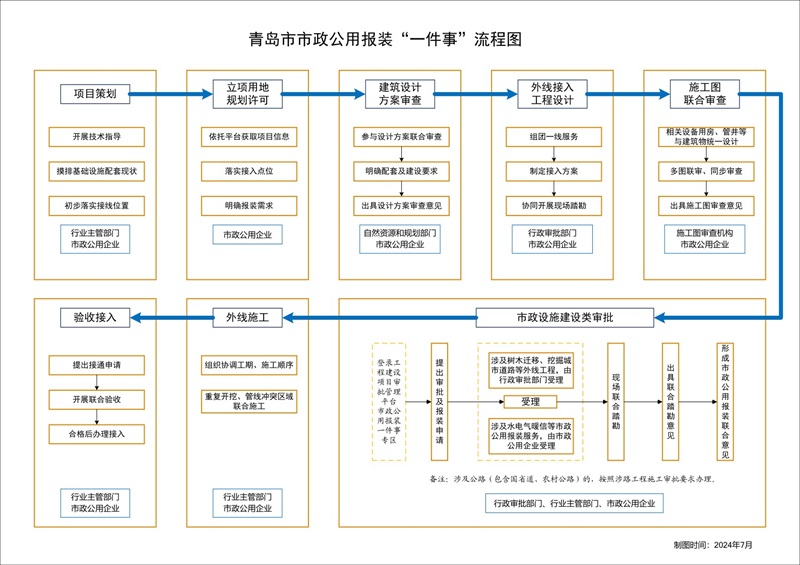 6.市政設施建設類審批階段。涉及外線工程的,市政公用企業(yè)或施工單位按照規(guī)定提出行政許可申請,行政審批部門組織相關部門開展聯(lián)合審批。市政設施接入涉及的審批環(huán)節(jié)全面推行全程網(wǎng)辦、并聯(lián)審批、告知承諾。外線工程涉及公路(包含國省道、農村公路)的,按照涉路工程施工審批程序辦理。