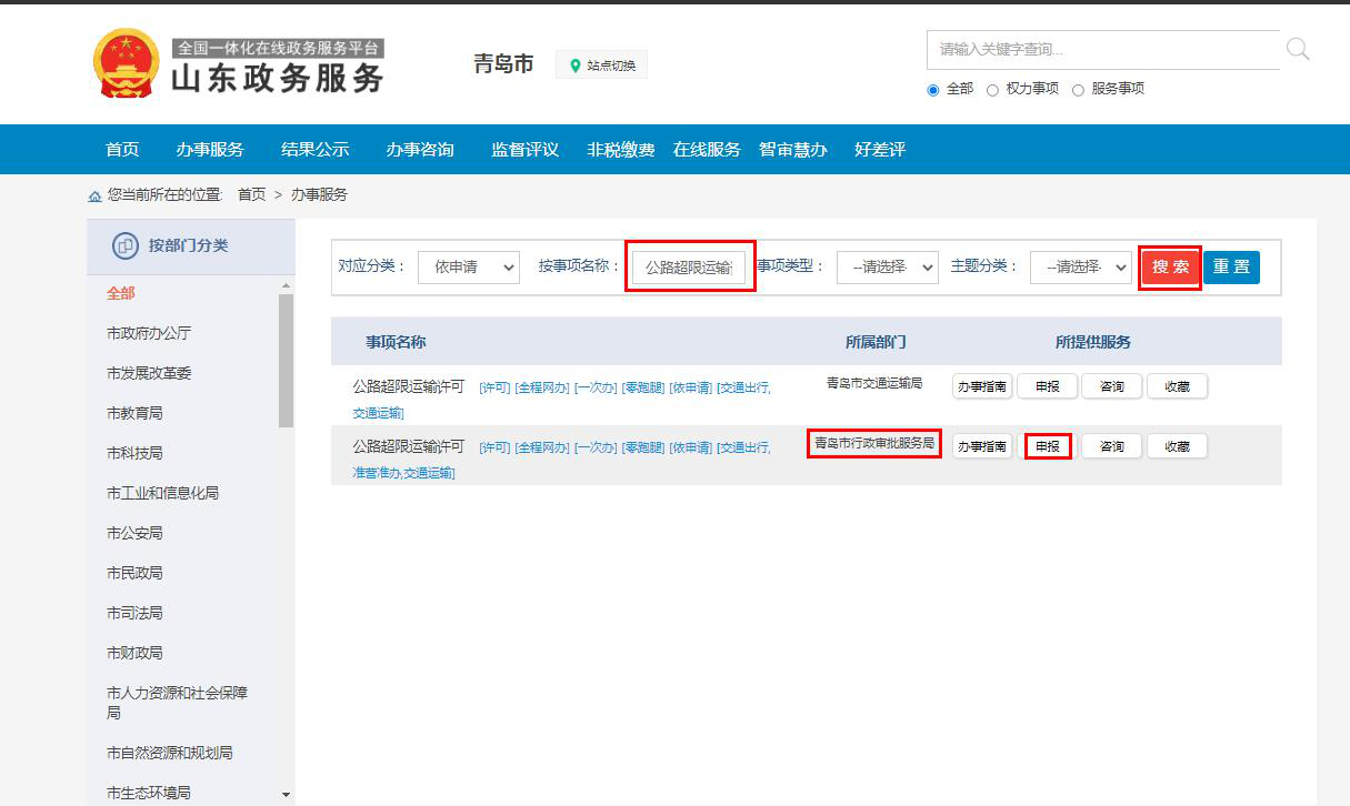 (3)辦理青島市范圍內(nèi)跨區(qū)(市)《超限運(yùn)輸車輛通行證》的,選擇所屬部門“青島市行政審批服務(wù)局”,點(diǎn)【申報(bào)】