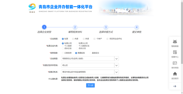 首先,選擇轉(zhuǎn)型后企業(yè)的類型和名稱申報,點擊【下一步】。