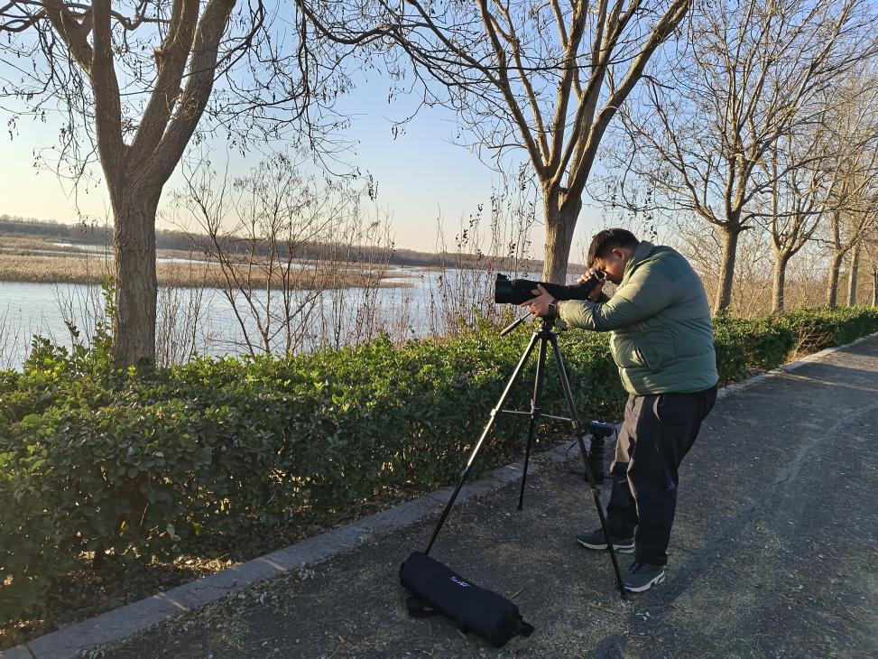 工作人員正在對(duì)已抵達(dá)大沽河的越冬水鳥進(jìn)行監(jiān)測(cè)