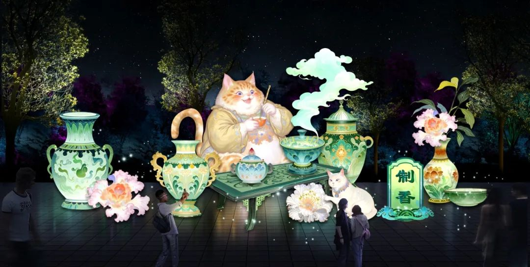 該區(qū)域位于北大草坪及以西部分區(qū)域,由“嶗韻流光”“漫步鮮花鎮(zhèn)”“機甲悟空”“瓷韻”“制香”“點茶”“書畫”“月闕云謠”等燈組組成。
