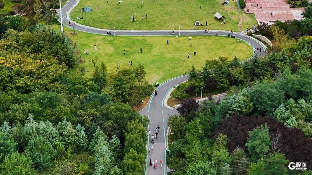 蜿蜒的木棧道依山而建,行人緩步而上,腳下木板輕響,抬頭便是層疊綠蔭;綠道上,有人騎著單車穿梭,衣角被風(fēng)掀起,笑聲落滿林間;草坪空地上,孩子們嬉鬧奔跑,幾頂帳篷搭在其間,親朋好友們閑談暢聊;不遠(yuǎn)處游樂場里,滿是孩子的雀躍呼喊,家長們坐在長椅上,笑著看孩子撒歡。