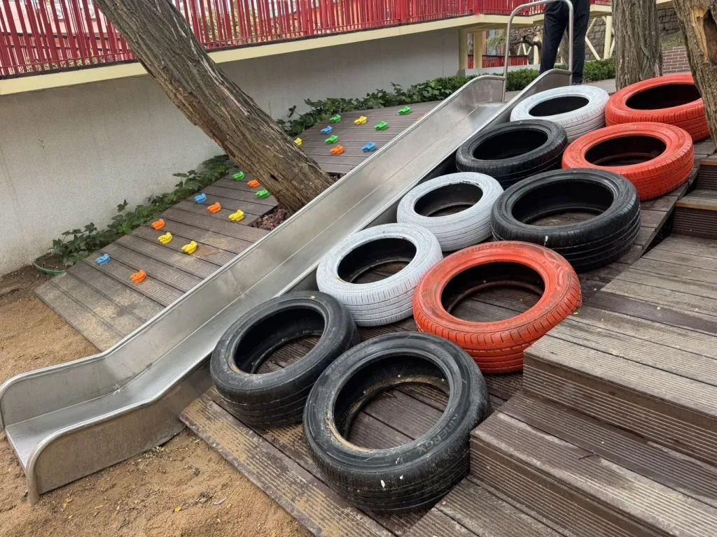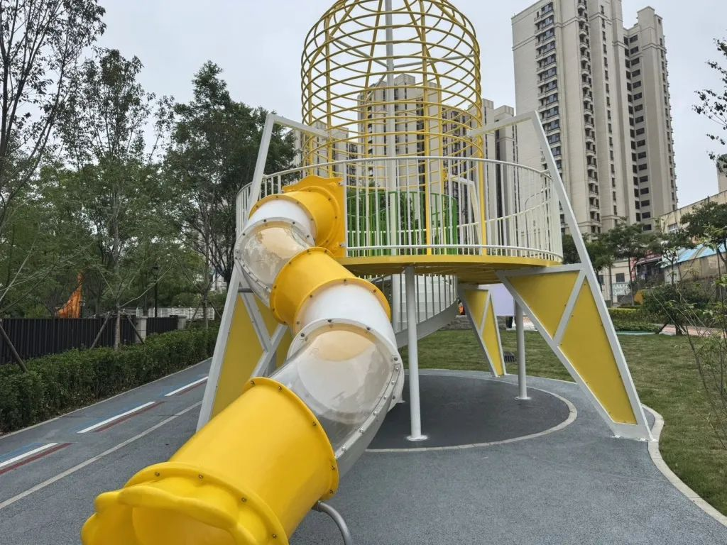 走下廊橋,則來到了另一方天地。地面鋪裝塑膠面層,廊橋的一側(cè)設(shè)置了乒乓球桌以及適老化休憩座椅,方便居民健身休閑;另一側(cè)則根據(jù)坡地地勢打造林下休閑活動廣場,靠近住宅區(qū)域開辟了兒童活動區(qū),增加滑梯、沙坑、攀爬游樂設(shè)施。這些設(shè)施充分考慮了不同年齡層市民的活動需求,打造了一個全齡友好的社區(qū)休閑場所。