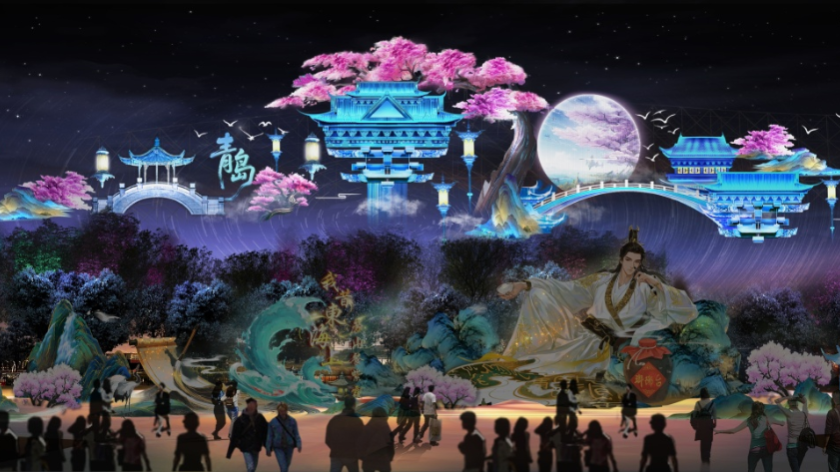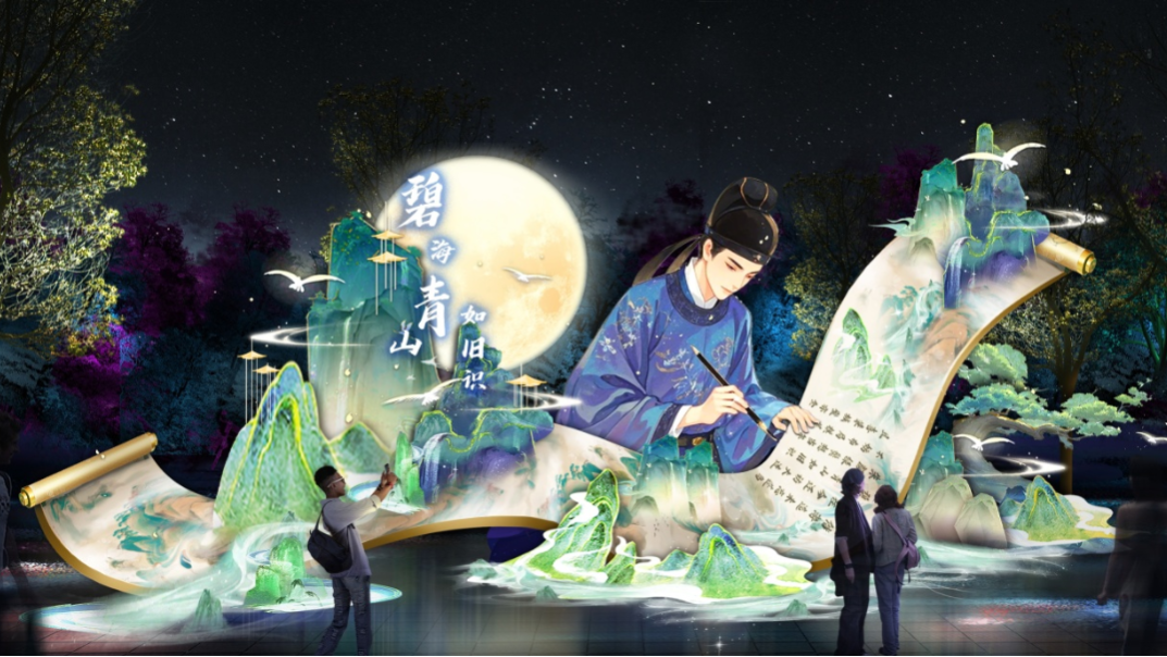 以青島的詩(shī)詞文脈為紐帶,融合嶗山山水、傳統(tǒng)建筑與現(xiàn)代光雕技術(shù),將歷代文人墨客筆下的山海神韻,化作流光溢彩的燈組在光影中徐徐鋪展。