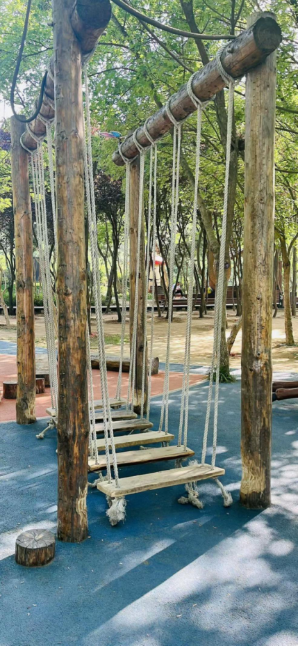 新增的攀爬架是座“反卷訓(xùn)練營(yíng)”,拒絕電子屏幕的“頸椎刺客”,只批發(fā)最原始的快樂(lè):當(dāng)孩子像樹(shù)懶抱住樹(shù)干般吊在繩索上時(shí),他們肌肉里覺(jué)醒的,是遠(yuǎn)古人類幼崽該有的山林記憶。 ?