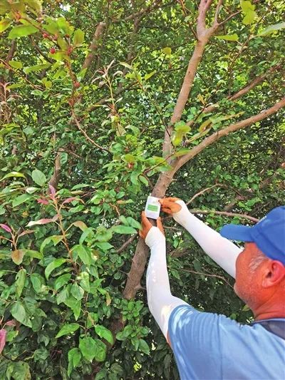 工作人員將裝有柞蠶蛹的紙袋精準(zhǔn)懸掛在樹(shù)干向陽(yáng)處。