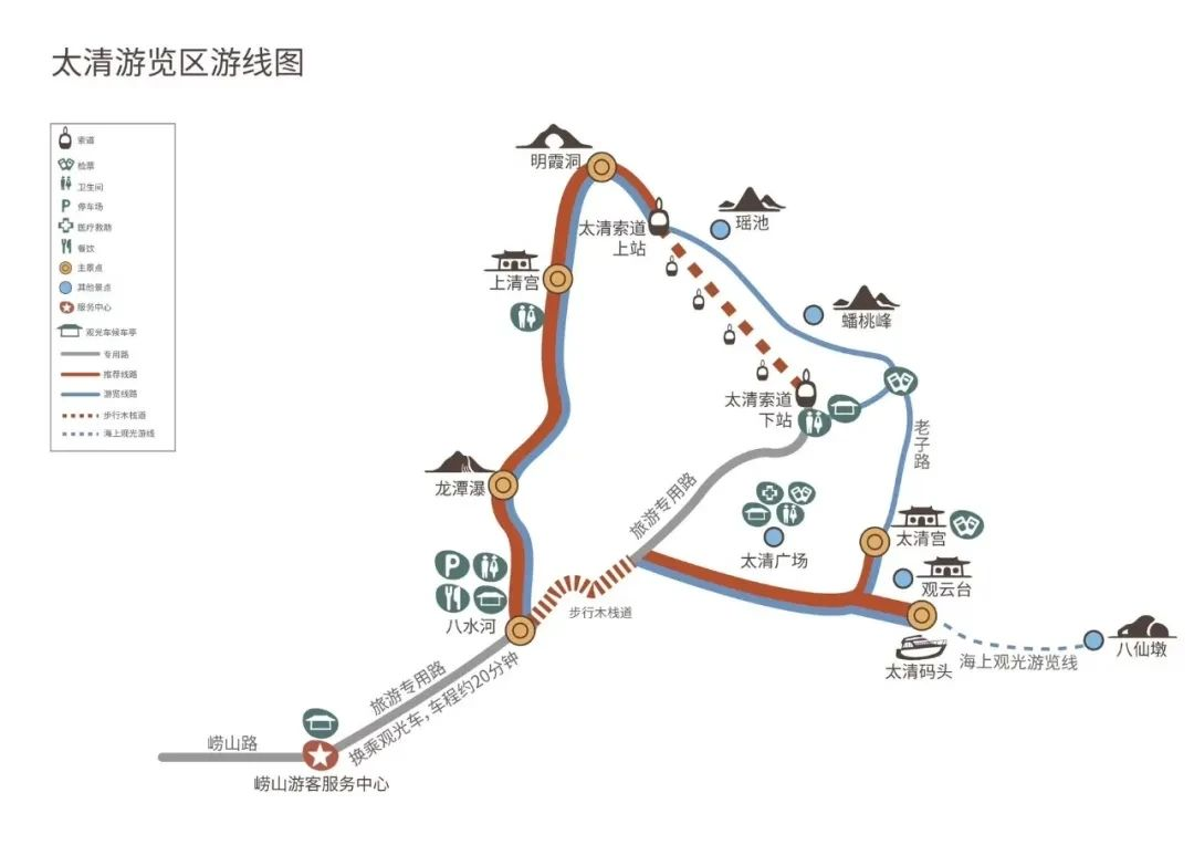 推薦線路①(乘索道上山):嶗山(大河?xùn)|)游客服務(wù)中心乘坐景區(qū)觀光車→八水河廣場(chǎng)下車→步行醉美山海木棧道→太清宮→沿老子路步行或在太清廣場(chǎng)乘坐觀光車至太清索道(上行)→明霞洞→上清宮→龍?zhí)镀佟怂印怂油\噲?chǎng)乘觀光車→嶗山(大河?xùn)|)游客服務(wù)中心。
