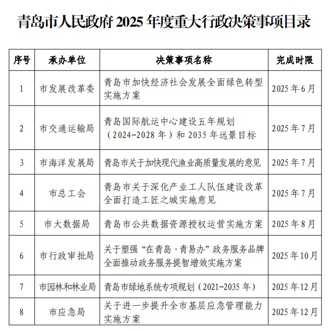 為規(guī)范重大行政決策程序,促進(jìn)政府科學(xué)、民主、依法決策,提高決策質(zhì)量和效率,按照《青島市重大行政決策程序規(guī)定》(市政府令第271號)要求,經(jīng)市委、市政府研究同意,市政府辦公廳組織市政府各部門對2025年重點(diǎn)工作事項進(jìn)行了梳理,篩選出具有基礎(chǔ)性、全局性和影響面廣的8項決策事項,決定納入青島市人民政府2025年度重大行政決策事項范圍,實行目錄清單管理。各有關(guān)部門和單位要嚴(yán)格按照公眾參與、專家論證、風(fēng)險評估、合法性審查的法定程序開展前期工作,并適時提交市政府常務(wù)會議審議。